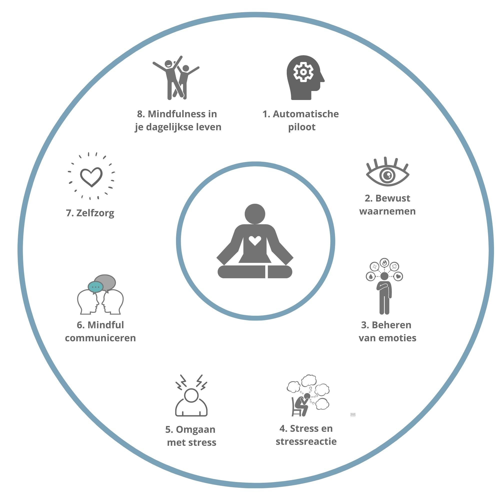 Met de training mindfulness ben ik begonnen omdat ik in mijn praktijk veel mensen zag die stress ervaarden. Vaak kwam de stress doordat ze over hun eigen grenzen heengingen. Mindfulness helpt je om beter naar jezelf en je gevoel te luisteren. Je leert je grenzen herkennen en respecteren. Je ontdekt dat je automatische reacties kunt vervangen door bewustere keuzes. Met als resultaat: minder stress, meer inzicht over hoe je met jezelf omgaat, meer compassie voor jezelf. Mindfulness betekent dat je je met volle aandacht bewust bent van het moment en je ervaring. Van daaruit kun je je gevoel gaan verkennen, met een open blik, zonder oordeel.